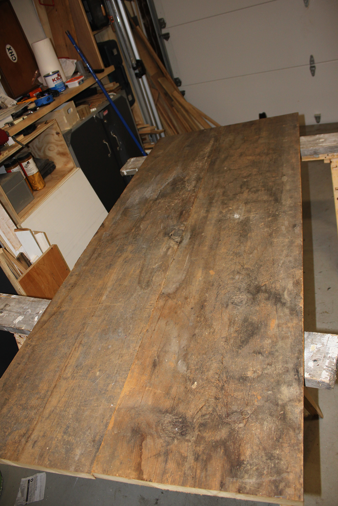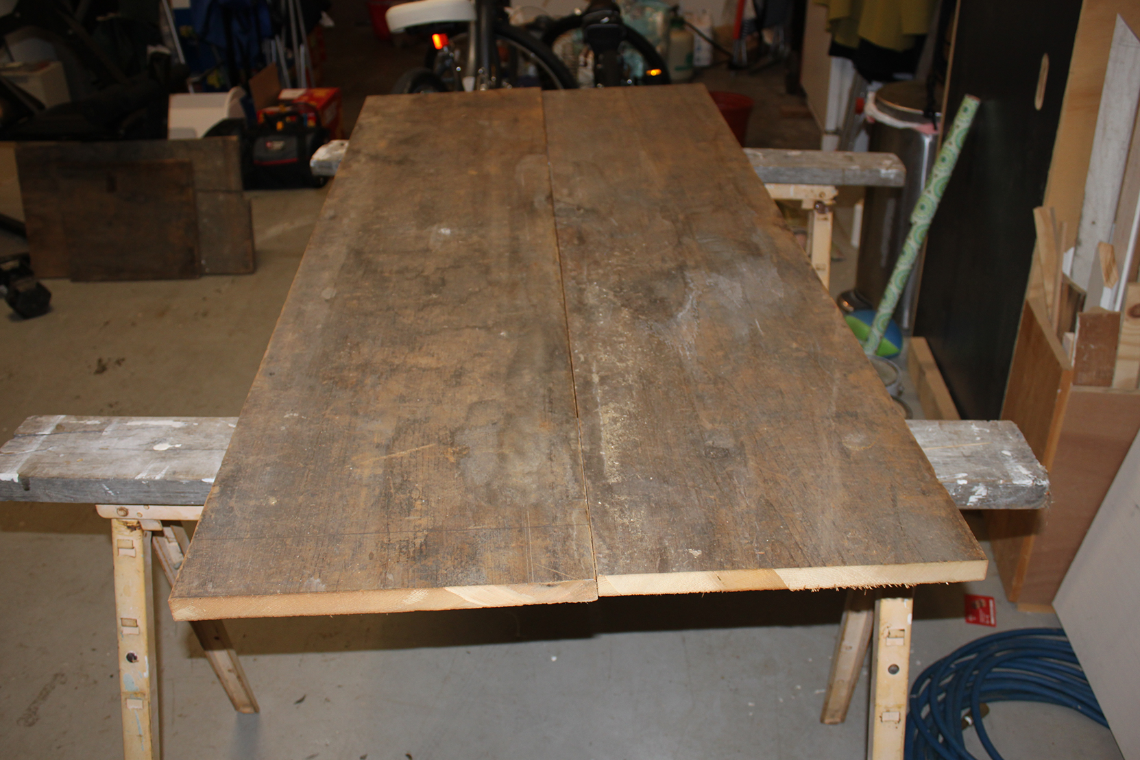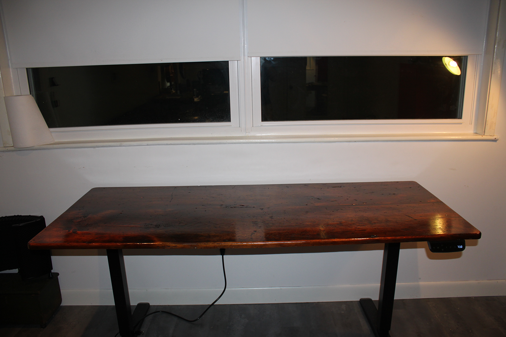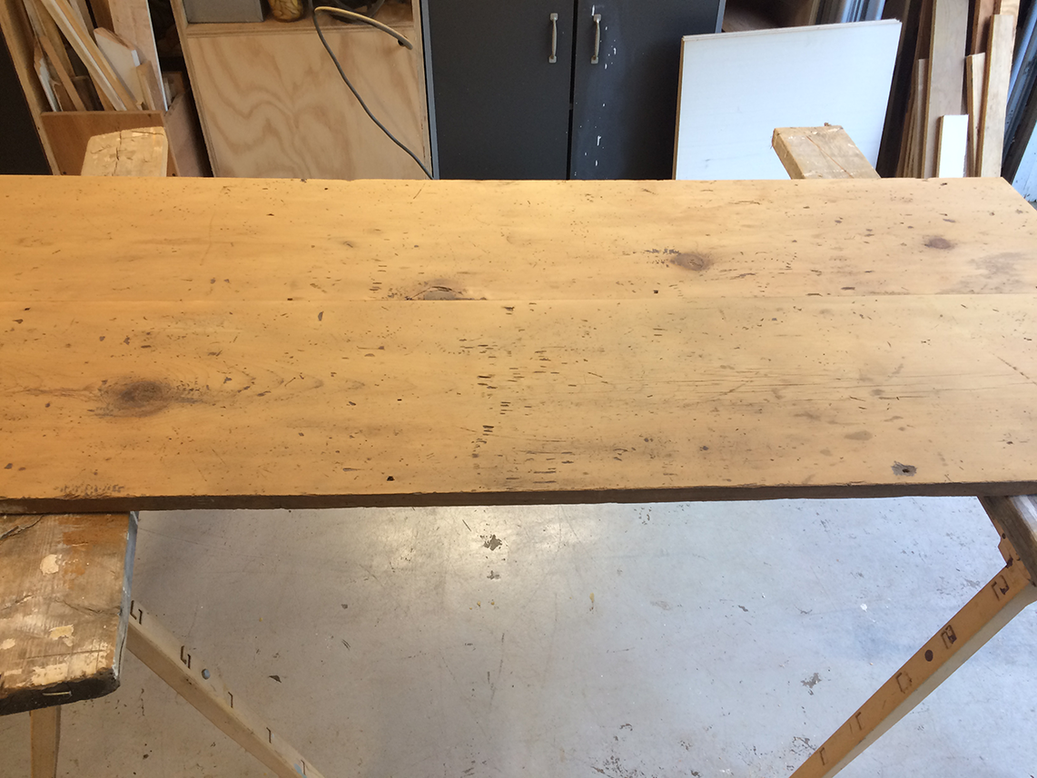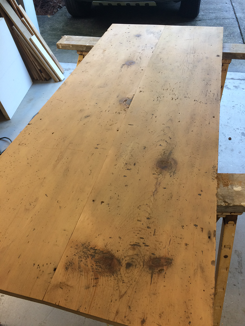 I recently purchased an adjustable standing desk base, but initially just dropped a 2'x4' birch plywood board on it. It was a nice introduction to working with a standing desk, but the working space was too small and the edges were very pointy. I wanted to see if I could make a nice desk from these boards from my father-in-law. He reclaimed them from the attic of a house on the Eastern Shore. Pine, I think, but wide (about 16") and very dirty and rough.
