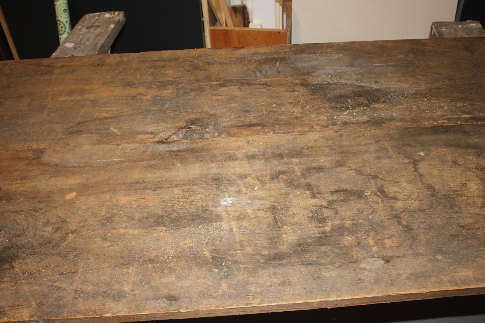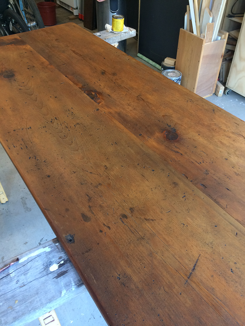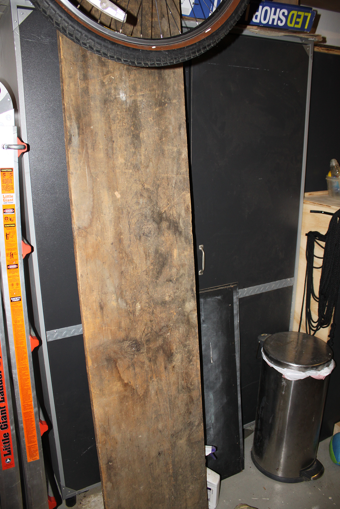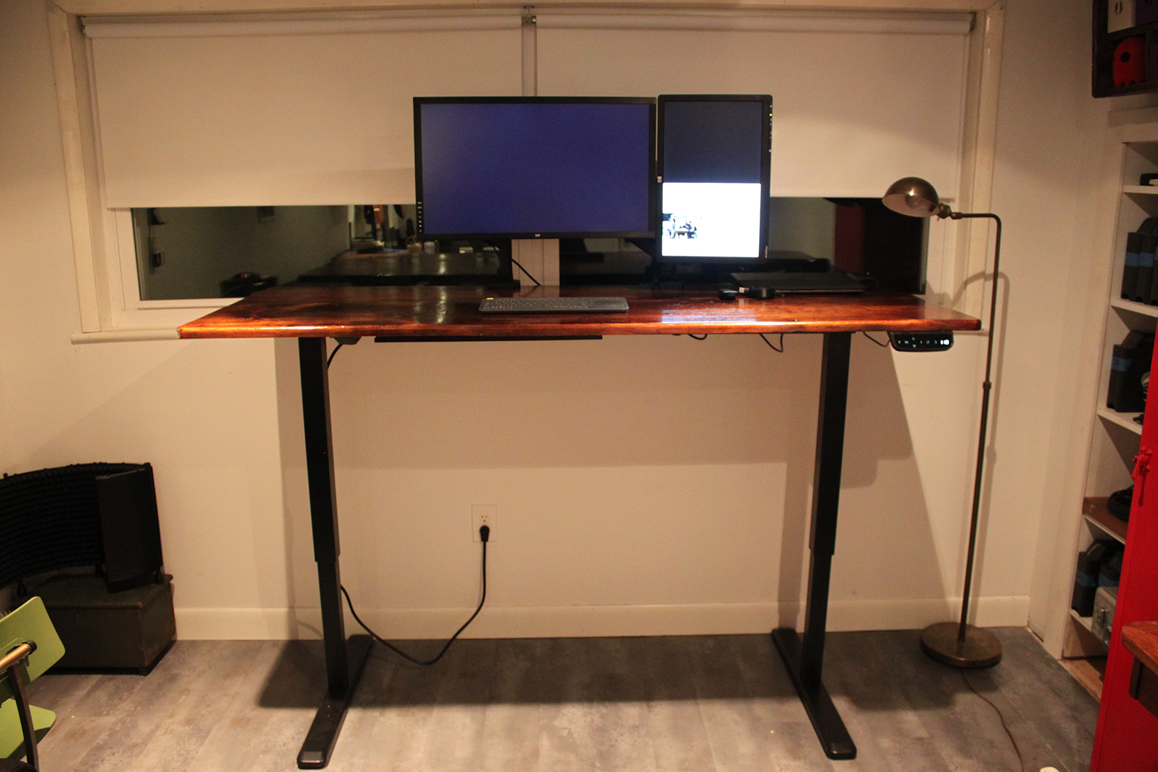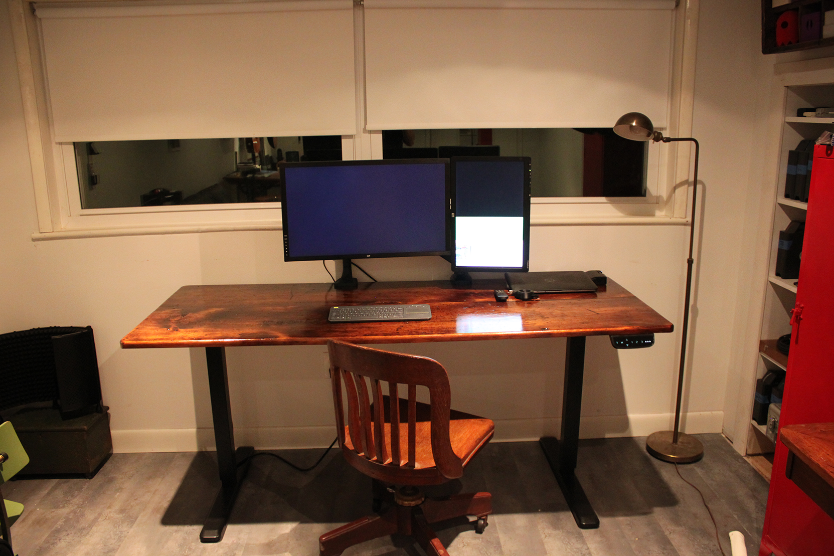I recently purchased an adjustable standing desk base, but initially just dropped a 2'x4' birch plywood board on it. It was a nice introduction to working with a standing desk, but the working space was too small and the edges were very pointy. I wanted to see if I could make a nice desk from these boards from my father-in-law. He reclaimed them from the attic of a house on the Eastern Shore. Pine, I think, but wide (about 16") and very dirty and rough.