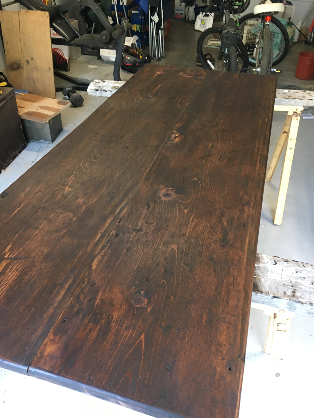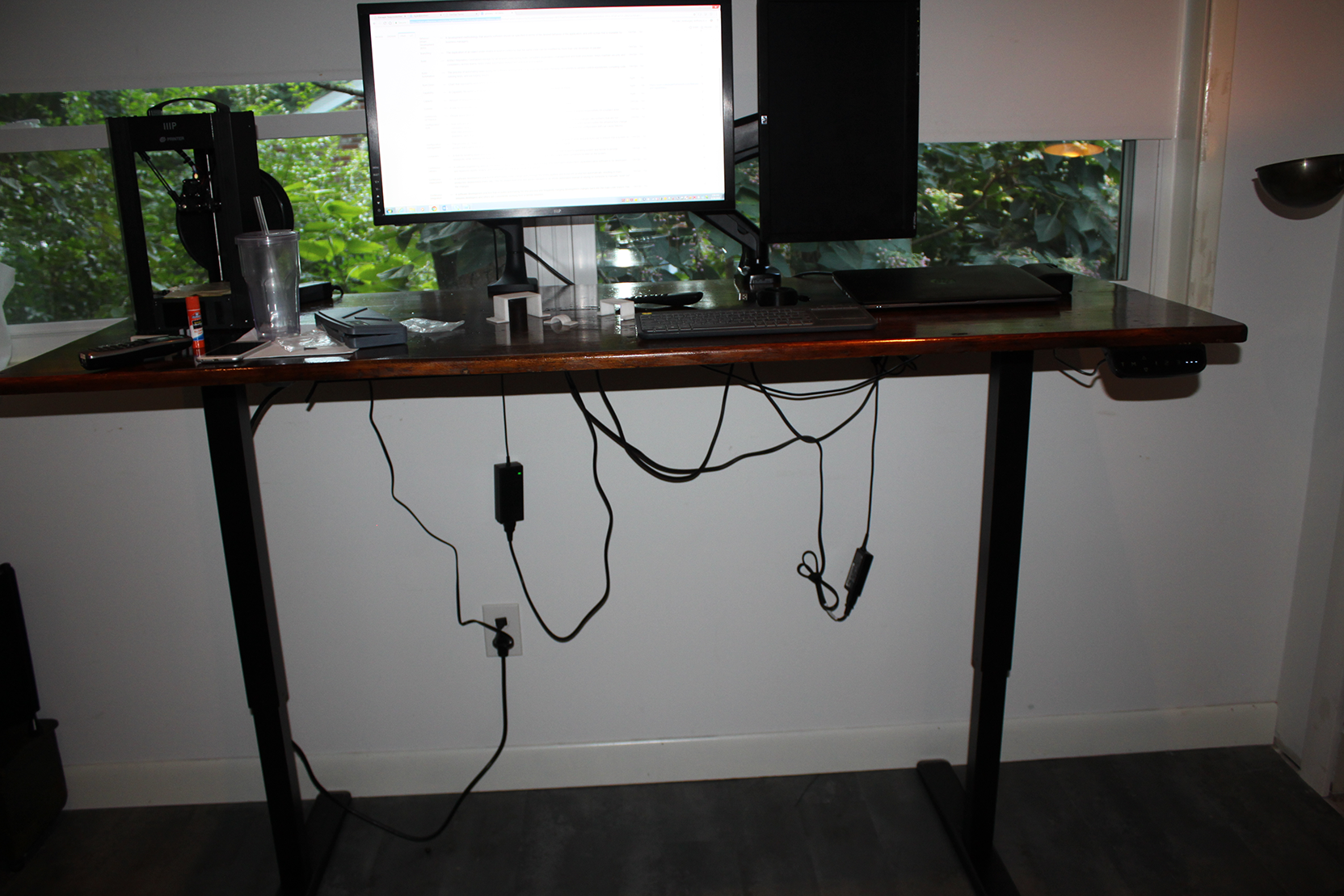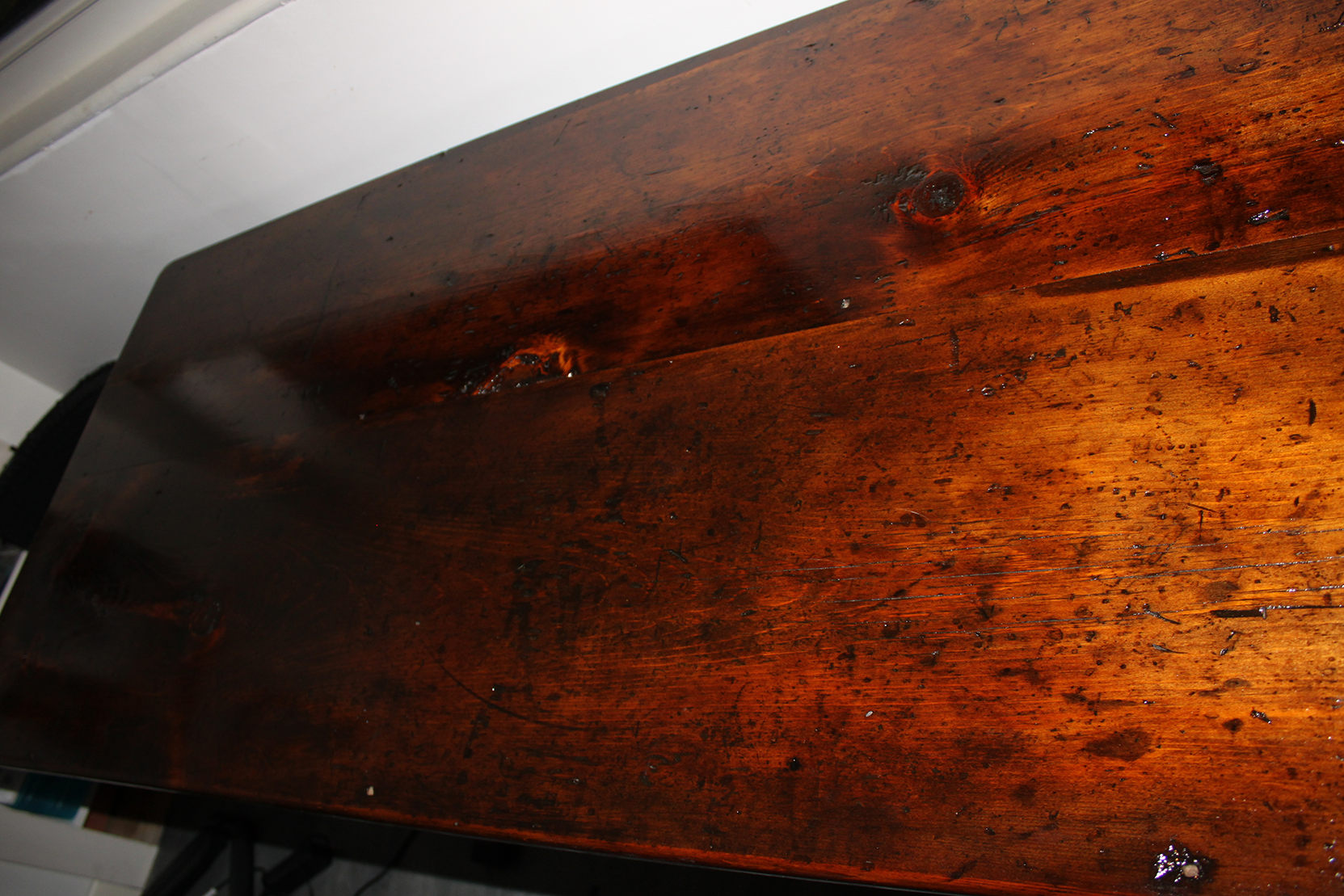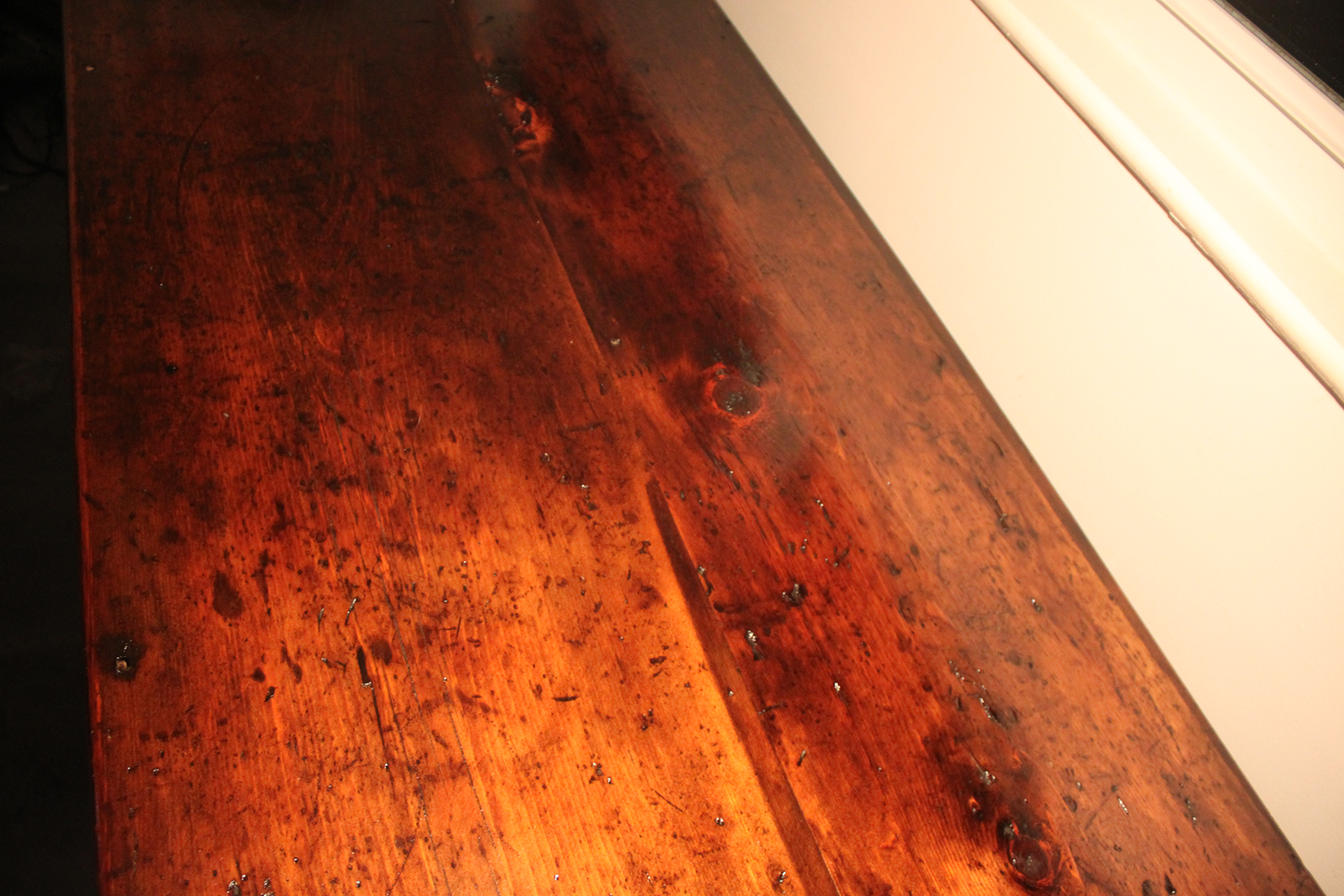 I recently purchased an adjustable standing desk base, but initially just dropped a 2'x4' birch plywood board on it. It was a nice introduction to working with a standing desk, but the working space was too small and the edges were very pointy. I wanted to see if I could make a nice desk from these boards from my father-in-law. He reclaimed them from the attic of a house on the Eastern Shore. Pine, I think, but wide (about 16") and very dirty and rough.