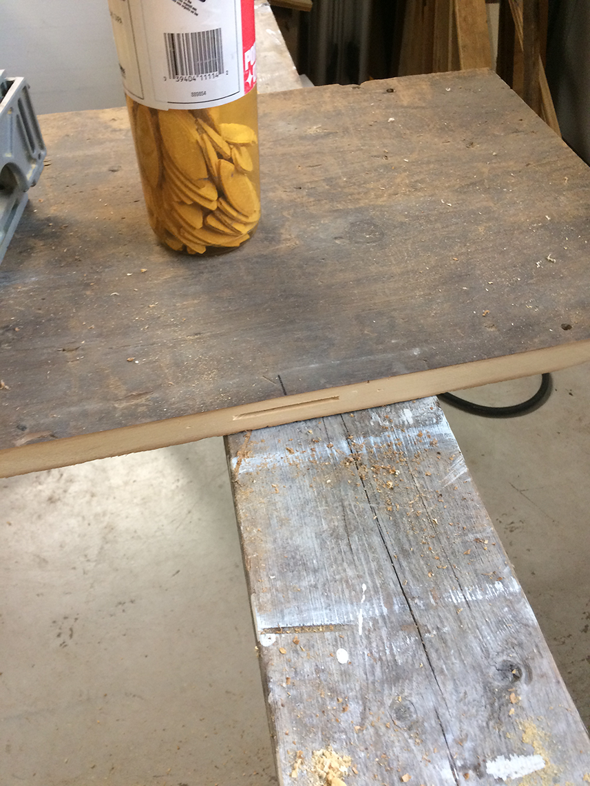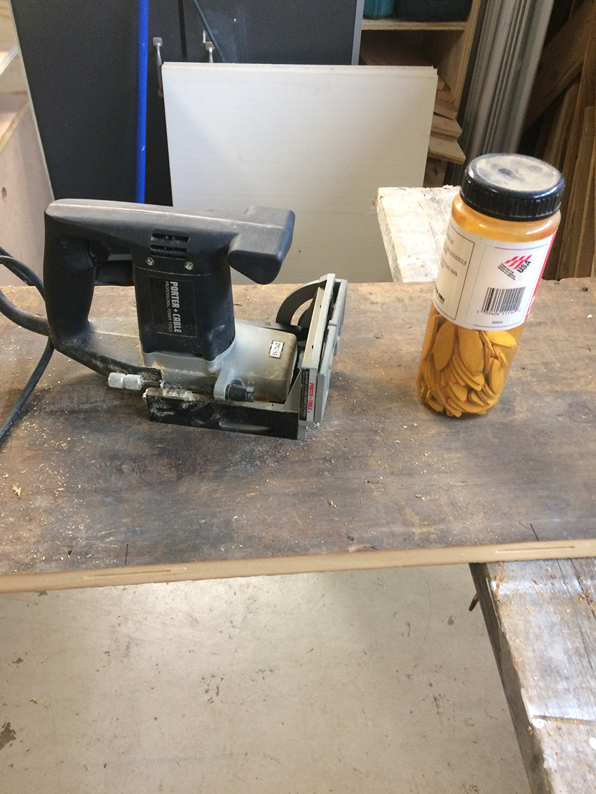 After ripping the boards to get a straight edge, my next step was to biscuit join them together. It was my first time using the joiner, so I was pleasantly surprised at how easy it was. I put the boards next to each other, and drew a pencil line straight across every foot or so to make sure the pockets for the biscuits were in the right place. Then I aligned the joiner with the pencil lines on each side to make the holes.