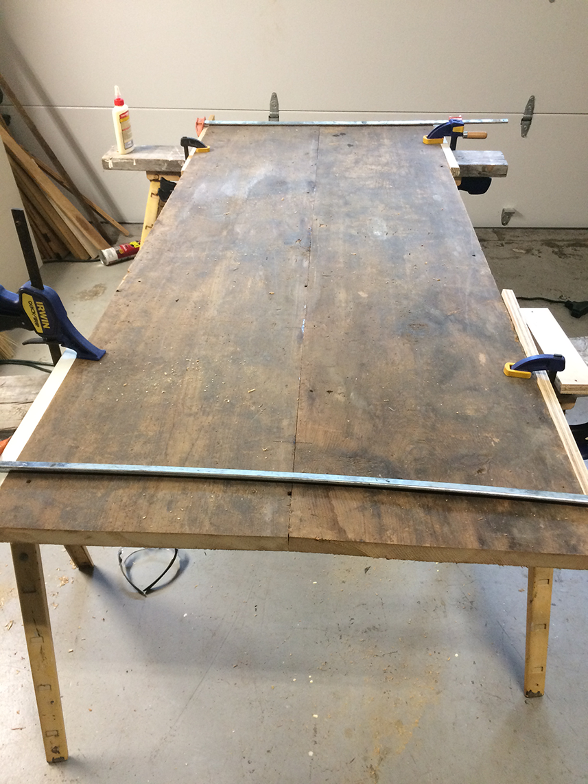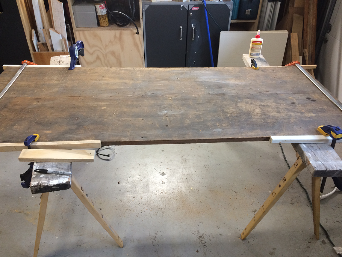 I put glue on each side of the biscuits, put the biscuits in the holes, then clamped the boards to each other, After some initial issues, I also clamped the boards down to the saw horses to keep it from buckling up in the middle. Then I let it dry overnight.
